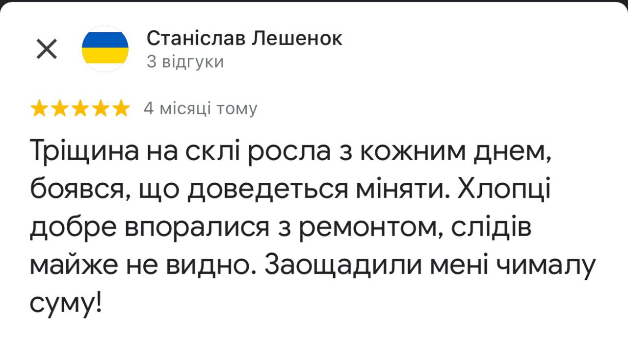 Відновлюємо лобові та бокові скла після сколів і тріщин. Працюємо швидко, ефективно і з гарантією на результат, щоб уникнути заміни скла, якщо це можливо.